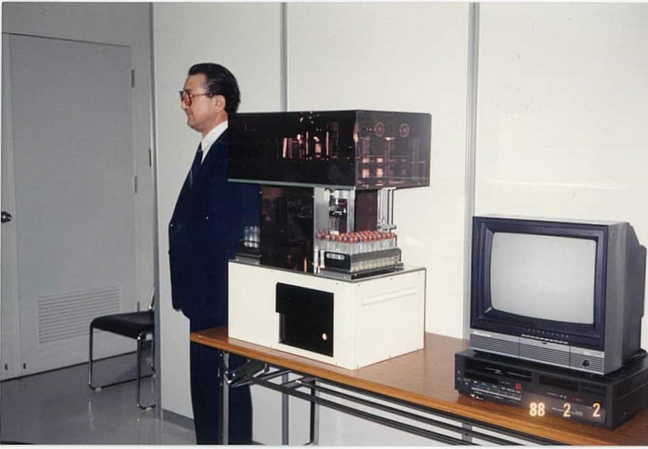 In 1981, Ito-san further advanced his automatic tube decapper concept, aiming to introduce safer, contact-free sample handling to the U.S. market. At the time, many hospitals had not yet recognized the need for such automation as labour was readily available despite lack of safety.